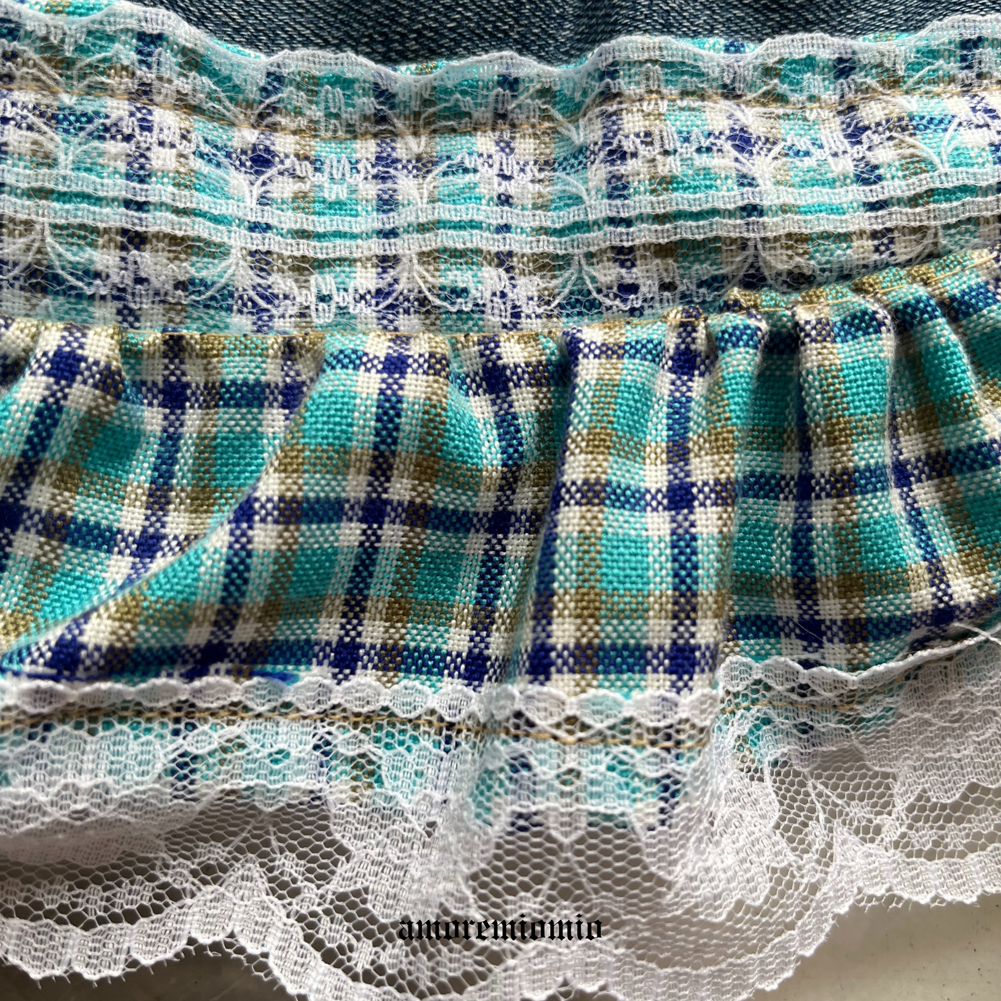 This reworked Y2K mini skirt is made from vintage denim and finished with a plaid cotton ruffle and delicate lace trim.