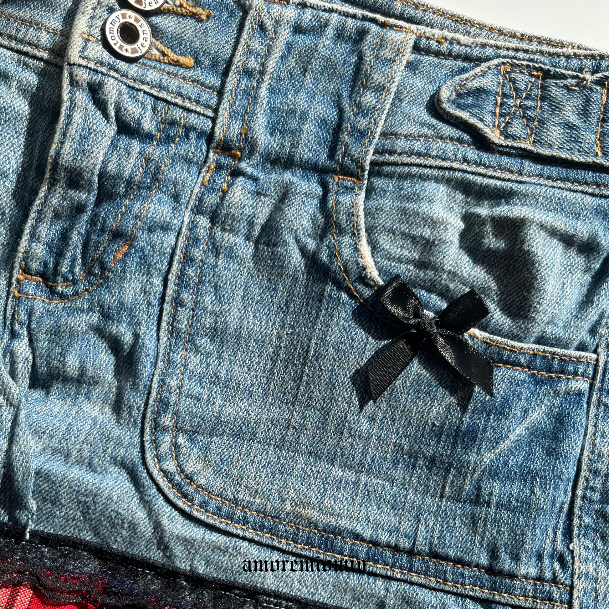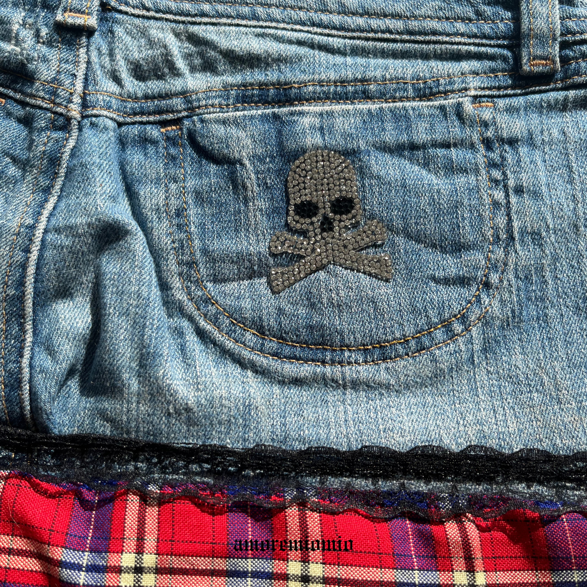 Low-Rise Denim Mini Skirt with Plaid Hem